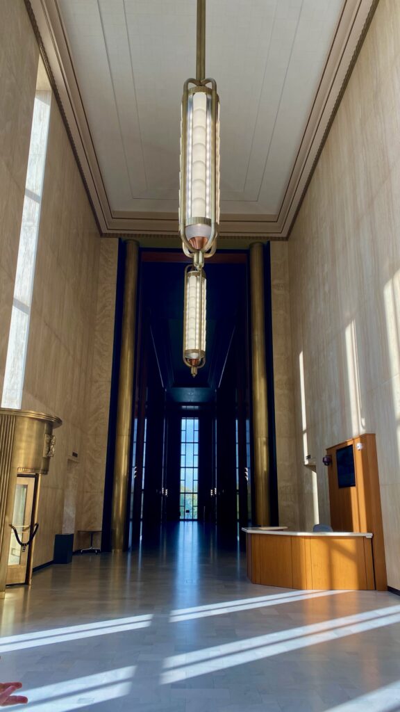 The North Dakota state capitol building is one of only 5 state capitols without a neo-classical dome. The others are in Nebraska, Louisiana, Oregon, and Alaska). It was built in an Art Deco style in the 1930s in just four years and on a tight budget due to the Depression. At 241 feet tall it is still the tallest building in North Dakota and we could see for miles and miles from its 18th floor observation deck. It’s not a pretty building from the outside but has some beautiful features inside and the state pays tribute to famous North Dakotans in “The Rough Rider Hall of Fame”.