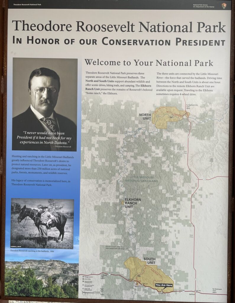 Theodore Roosevelt first visited the Dakota Territory in 1883 to hunt bison, but a personal tragedy a year later led him back here to re-center. He built a ranch, which ultimately failed, but the rugged beauty brought him back again and again for the rest of his life. More importantly, Roosevelt credited his experiences in the badlands for shaping his character and his preservation policies. As president, he established the U.S. Forest Service and signed the 1906 Antiquities Act, under which he proclaimed 18 national monuments. He worked with Congress to create 5 national parks, 150 national forests and dozens of federal preserves resulting in over 230 million acres of protected land. Needless to say, he drastically expanded the national park system. He championed it and it has served as a model for other countries preserving land around the world. To honor Roosevelt, the Theodore Roosevelt National Park was established in 1947.